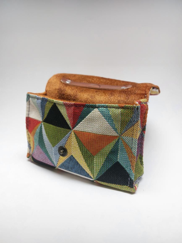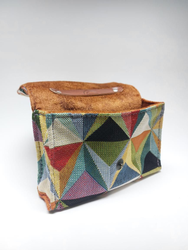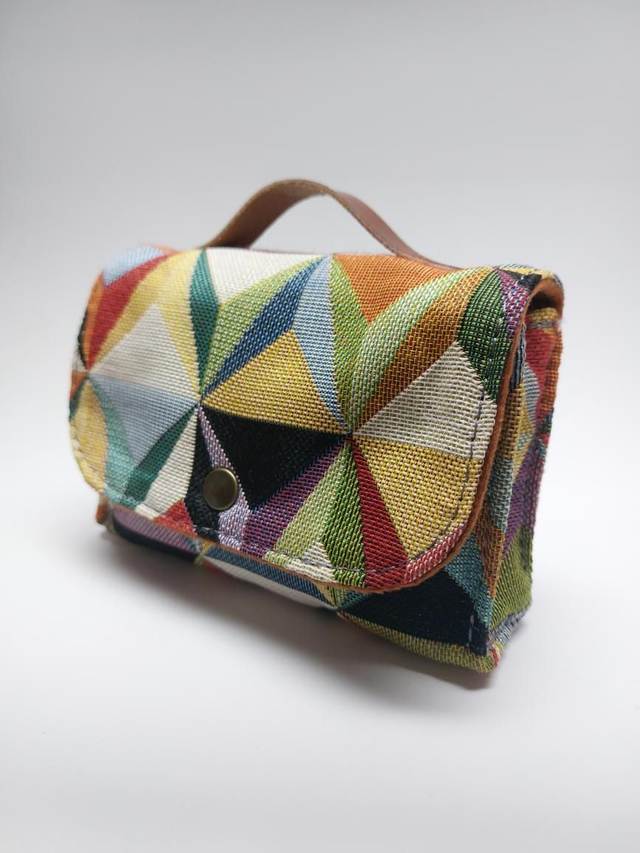 Petite pochette valise réalisée avec des chutes de tissu d'ameublement. Doublure en tissu 100% velours PES et une anse en cuir rivetée sur le dessus.
