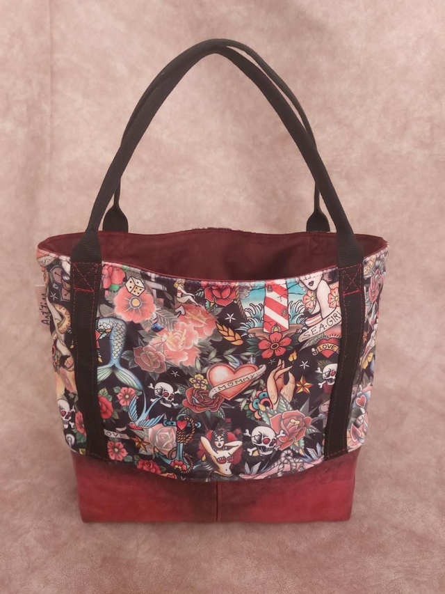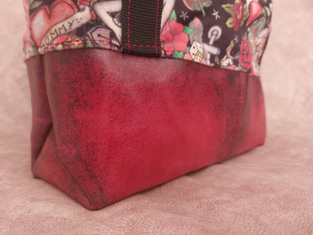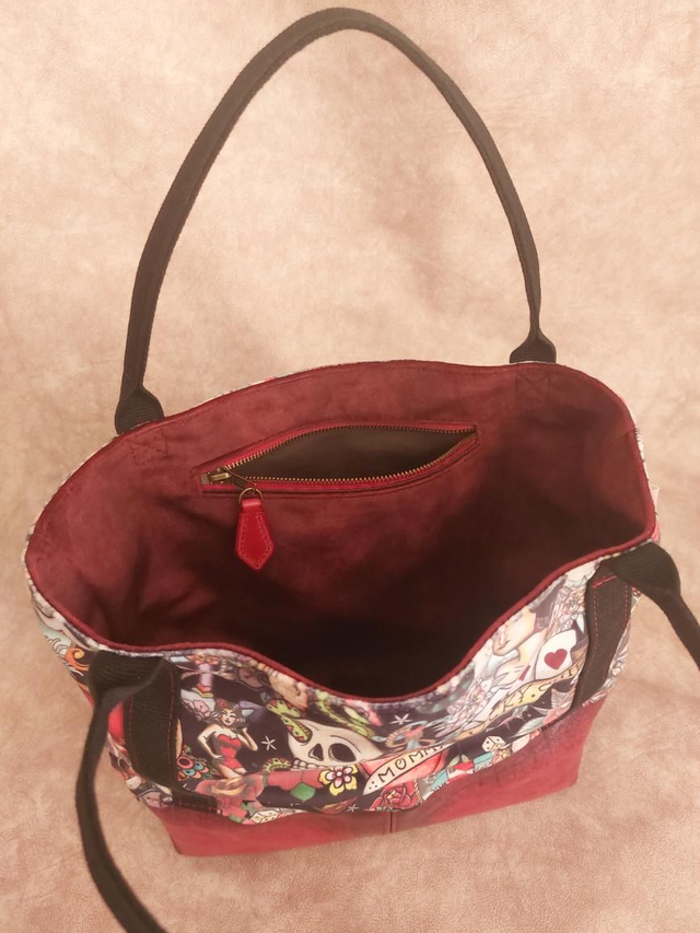 Sac cabas avec le fond en cuir (teinté à la main) et le corps en tissu velours. Intérieur entièrement doublé en velours avec deux petites poches simples ainsi qu'une poche avec fermeture à glissière.